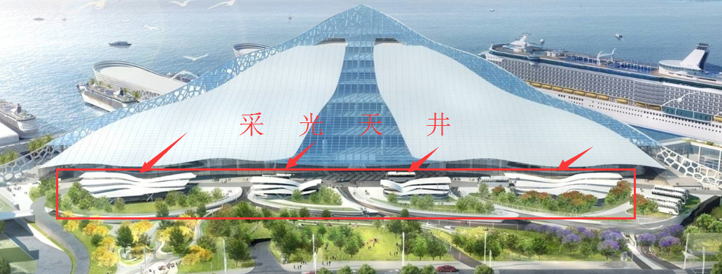 健康舒适也是新国标绿色建筑标准的新要求,作为大型的交通枢纽型公共建筑,邮轮中心采用了被动式绿色建筑措施,如大规模的玻璃采光屋顶,极大降低了照明能耗,提高了室内空间的光照质量。通过大空间自然通风,在过渡季减少空调负荷,保证了室内空气质量良好。其他措施如环境烟控、优良照明、无害材料装修、地下室采光天井等,都能够极大地保证项目的环境健康舒适。