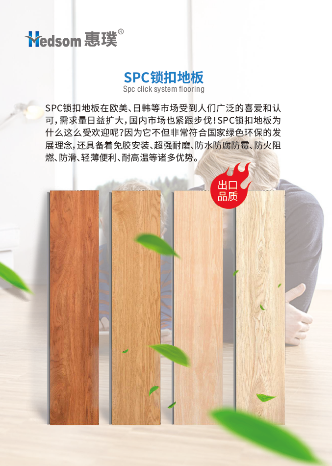 ⼴州惠璞建材有限公司致⼒于研究、设计和⽣产新型环保节能的建筑材料,提供⼀体化的地⾯解决⽅案。惠璞为广大客户提供广泛的新型环保的地面材料产品。民用方面新型环保的片材地板以源于欧美的PVC锁扣片材地板为主,颜色丰富,多样化组合,消费者可以自己动手安装,可以用在新房装修及使用于现有瓷砖地面上直接铺贴,简单快捷,为家庭装修提供丰富的选择,满足广大消费者对于环保绿色建材的需求。惠璞商用地板有PVC同透和多层复合卷材,PVC运动地板,防静电PVC地板,亚麻地板,智能布线架空地板等产品,广泛用于医院,学校,办公室,健身房,运动场馆,商店,仓库,工厂洁净室,超甲写字楼布线等场所。