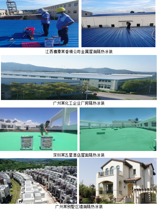 本产品添加了特殊的红外线反射颜料和中空微珠,适用于大型工厂、物流仓库、化工储罐、饲料储藏罐、家禽饲养场等建筑结构的各类材料表面,可以极大程度反射太阳光中的红外热能,有效降低涂膜表面温度,防止因高温而引起的涂膜快速老化,延长使用寿命。由于使用了强耐候性有机硅丙烯酸树脂和防紫外线老化剂(HALS),具有超强耐候性能;具有优良的耐酸雨以及抗大气污染的防腐功能;大面积的工程使用,可使金属屋面最高降温达15-17℃,有效降低建筑结构内部温度,减少制冷成本支出,提高企业经营效益。