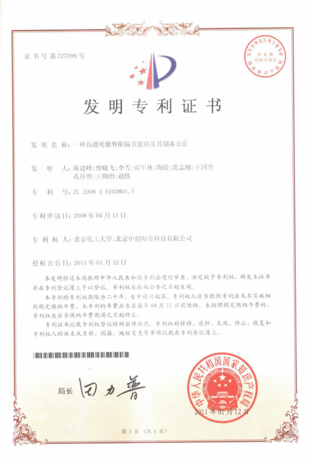ENP汉膜建筑玻璃隔热节能膜,该材料为我国自主知识产权产品,发明人陈建峰教授曾任北京化工大学党委常委、副校长,2018年6月担任中国工程院秘书长。该产品是目前国家住建部推广的唯一一款玻璃隔热节能膜产品,获得安徽、江苏、湖南、重庆等省推广证书。