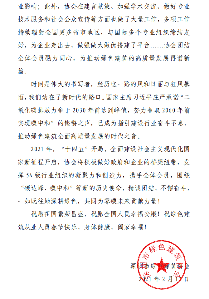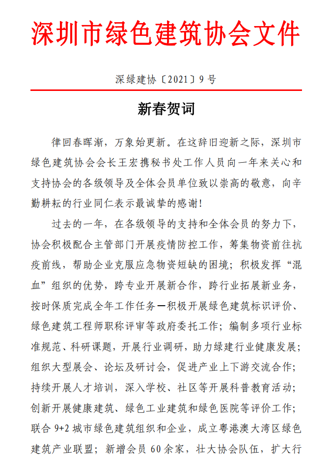 一元复始,万象更新。携手推动绿色健康建筑的发展已成为全世界的共识,打造绿色城市、建设美丽深圳,是我们始终为之努力践行的方向。新的一年,让我们以一往无前的奋斗姿态、风雨无阻的精神状态,继续开展深圳市绿色建筑的创新、交流与合作,推动绿色建筑事业的健康发展。祝大家新春快乐,牛年大吉!