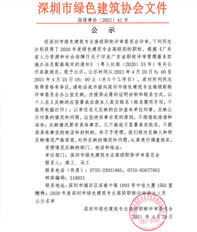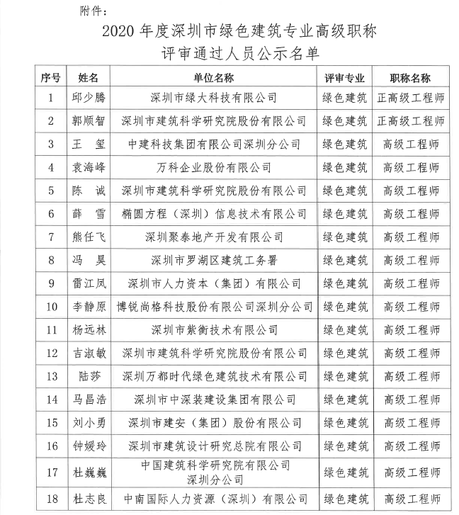2020年度深圳市绿色建筑专业高级职称评审通过人员名单公示