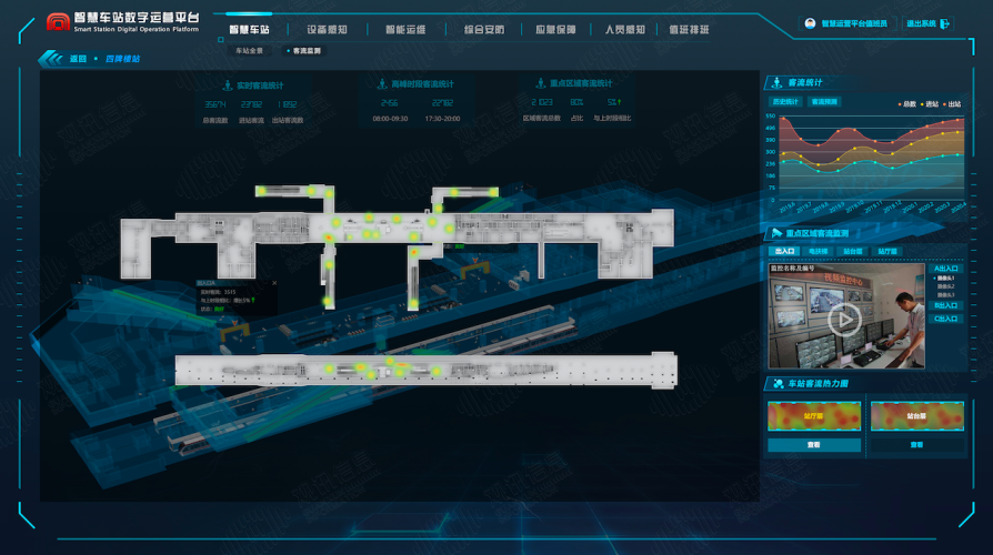 以观讯信息自主研发的智慧车站三维综合管理平台,以车站的BIM和GIS三维数据作为基础数据,与车站的各为联网数据进行基础,实现三维可视化的动态管理。主要集成了视频监控系统、安检系统、AFC系统、电梯控制系统、门禁系统、智慧消防系统、智能环控系统、能耗分析等系统。实现车站运营对设备、环境、能耗、客人、安检的实时监测。