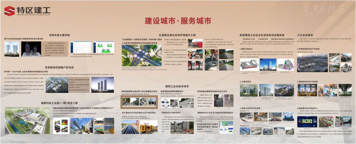 深圳市特区建工集团有限公司(简称“特区建工集团”) 是深圳市国资委为深化国资国企改 革,推动深圳建筑业高质量发展,整合深圳市天健(集团)股份有限公司、深圳市建安(集团) 股份有限公司、深圳市建设(集团)有限公司、深圳市路桥建设集团有限公司、深圳市综合 交通设计研究院有限公司而形成的大型建工产业集团。特区建工集团于 2019 年 12 月注册成 立,注册资本金 50 亿元,定位于深圳市建工产业链投资和经营平台,与央企协同、带动优质 民企共同发展的市级平台。 特区建工集团未来的发展,设计咨询业务是引领、基础设施投资是带动、工程总承包能力是 关键、建筑科技创新能力是引擎。主要业务板块包括建筑设计、建筑施工、建筑工业化、城 市综合管养、专业开发、建筑科技产业六个方面,其中建筑设计业务致力于打造深圳市综合 能力突出的全过程咨询服务商;建筑施工业务将全面增强市政、房建、公路、海洋工程、钢 结构、机场、港口与航道工程、地下空间开发等建筑全领域的工程总承包能力;建筑工业化 业务以装配式建筑、装配式桥梁、沥青砼和水泥砼生产为核心,构建建筑工业化多元化生产 能力;城市综合管养业务将探索成为国内城市基础设施一体化智慧化管养;专业开发业务将 推动“建工 + 民生地产”的业务,提升城市产业空间保障能力;建筑科技业务将建设深圳建 筑产业园区,集聚建筑产业发展技术、应用、人才等关键要素。 特区建工集团拥有市政、建筑施工总承包“双特级”资质,市政及房建专业设计甲级资质, 多项市政公用工程、建筑工程、公路工程、机电工程施工总承包壹级资质。多年来,特区建 工集团承建了深圳市市政道路、高速公路、建筑工程、桥梁工程、轨道交通、供排水设施、 公共建筑、管廊等数百项重大工程,承担了深圳市 70% 以上的道路、桥梁、隧道管养任务。 特区建工集团将以“建工 + 创意”“建工 + 科技”“建工 + 民生地产”“建工 + 金融”为重心, 努力走出专业、科技、创新发展之路,计划到“十四五”末发展成为营业收入过千亿的大型 综合性建工产业集团。