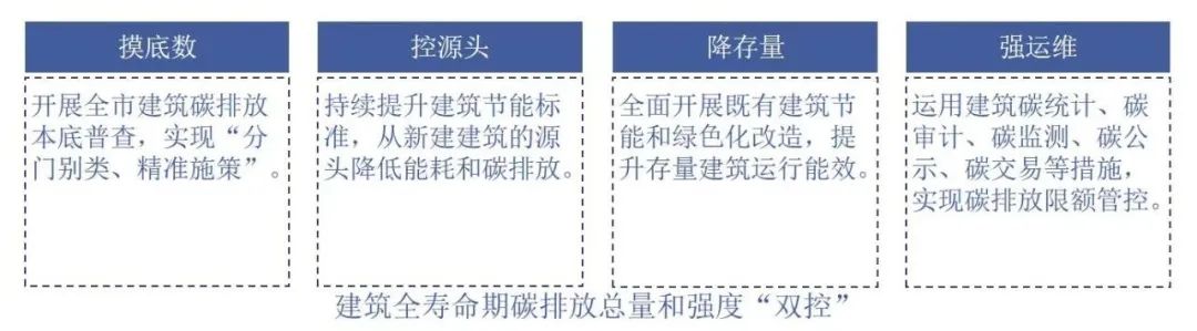 从“摸底数、控源头、降存量、强运维”方面建立建筑全寿命期碳管控,运用建筑碳统计、碳审计、碳监测、碳公示、碳交易等措施,实现碳排放限额管控。