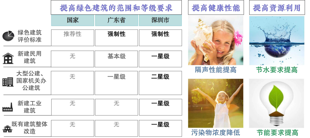 ● 2022年发布实施《深圳经济特区绿色建筑条例》,在全国首度将包括工业建筑在内的全部建筑纳入绿色建筑标准建设和运营的强制范围;首次以立法形式规定了建筑领域碳排放控制目标和重点碳排放建筑名录,将“碳达峰、碳中和”融入绿色建筑全寿命期管控;对建筑绿色性能提出更高要求,切实提高百姓对绿色建筑的获得感和体验感。