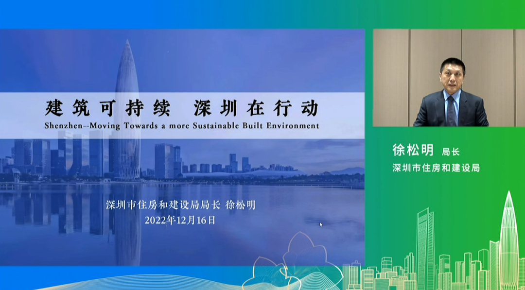 近日,“大湾区可持续建筑环境会议2022”在香港会议展览中心以“线上+线下”形式隆重召开。会议以“实现大湾区可持续和碳中和建筑环境”为主题,汇聚来自内地和香港的重量级代表,全面介绍大湾区建筑和建造业各主要参与方在领导和促进碳中和这一重要使命的政策、路线图、战略及行动。深圳市住房和建设局徐松明局长受邀以线上参会形式分享深圳建筑可持续发展经验,备受大湾区业界瞩目。
