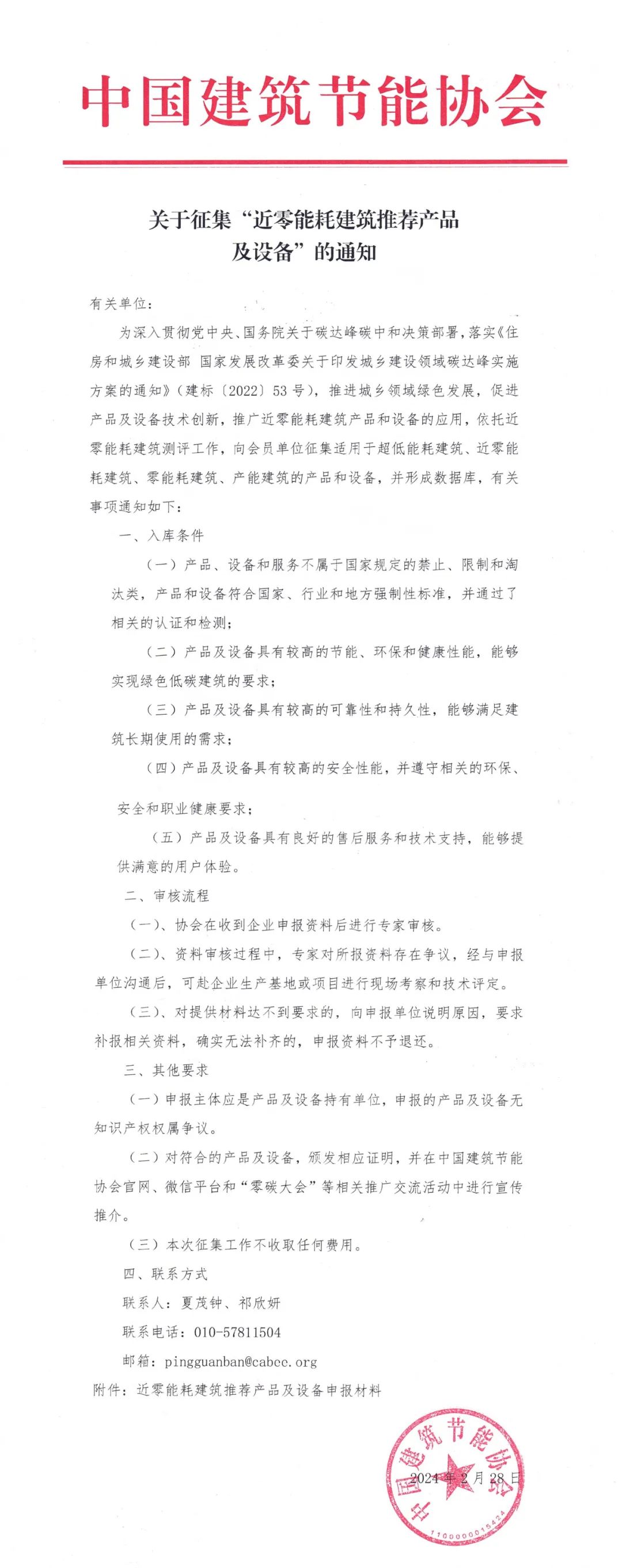中国建筑节能协会关于征集“近零能耗建筑推荐产品及设备”的通知