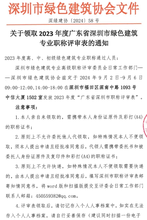 关于领取2023年度广东省深圳市绿色建筑专业职称评审表的通知
