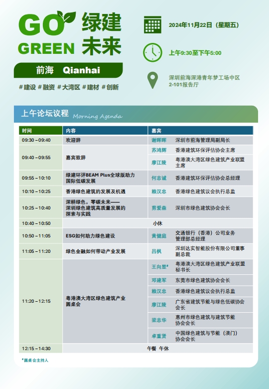 由深圳市前海管理局指导,粤港澳大湾区绿色建筑产业联盟副主席单位——香港建筑环保评估协会、香港绿色建筑议会和hth网页版怎么进联合主办,粤港澳大湾区绿色建筑产业联盟协办的“GO Green 绿建未来论坛@前海”将于11月22日在前海深港青年梦工场举行。