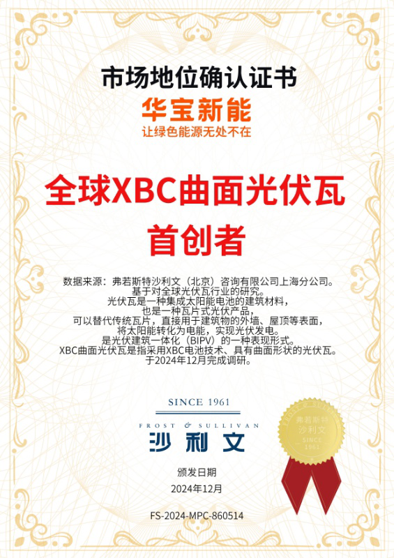 华宝新能获沙利文“全球XBC曲面光伏瓦首创者”市场地位确认证书